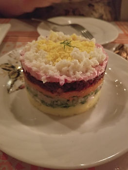 We tested the Soul with a drive halfway across Portland to Kachka. This is apparently the “It” place on any night in Portland, and with good reason. Trusting again to Yelp reviewers, we ordered “Herring Under a Fur Coat”. Bizarre as the name is, the dish itself is more so. It arrives as a cylindrical, free-standing, stratified tower with only its own top layer for garnish. It needs no more dressing than that, though. A creamy base of Yukon Gold potatoes supports a glossy, silver and green bar of herring with parsley, topped in turn with a brilliant orange layer of shredded carrot, over which rests a rosy round of beets. Then comes the pretty pink layer of beet mayonnaise, and finally concentric rings of egg white and egg yolk dotted with dill. I made strange faces when I first read the description, too. As I said, we ordered this only because so many reviewers insisted on trying it. I was completely expecting to be Tom Sawyered at the collective amusement of all Yelp readers. After all, I actually hate the fishy taste of most fish, and herring is a particularly fishy fish.